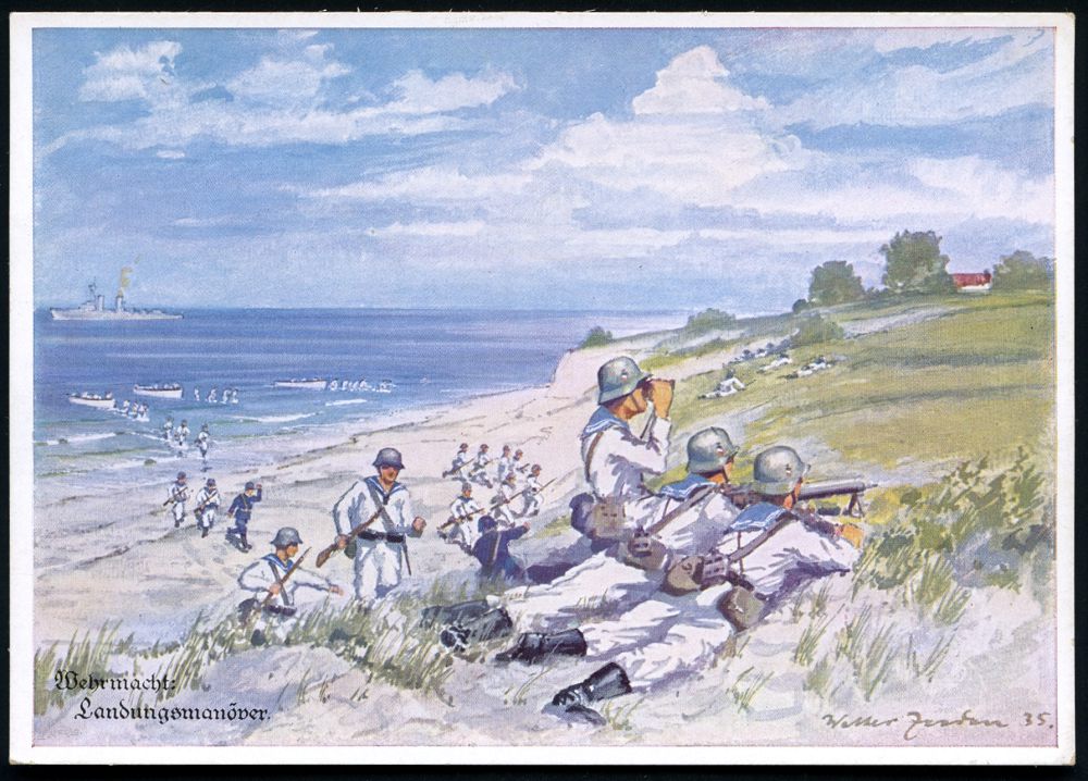 | 3076 | 12 € | DEUTSCHE KRIEGSMARINE 1933-1939 : DEUTSCHES REICH 1935 Color-Künstler-Ak.: Wehrmacht Landungsmänover (Marine-Infanterie), sign. Walter Zeeden ´35 , ungebr. (Verlag Andelfinger, München) | | |