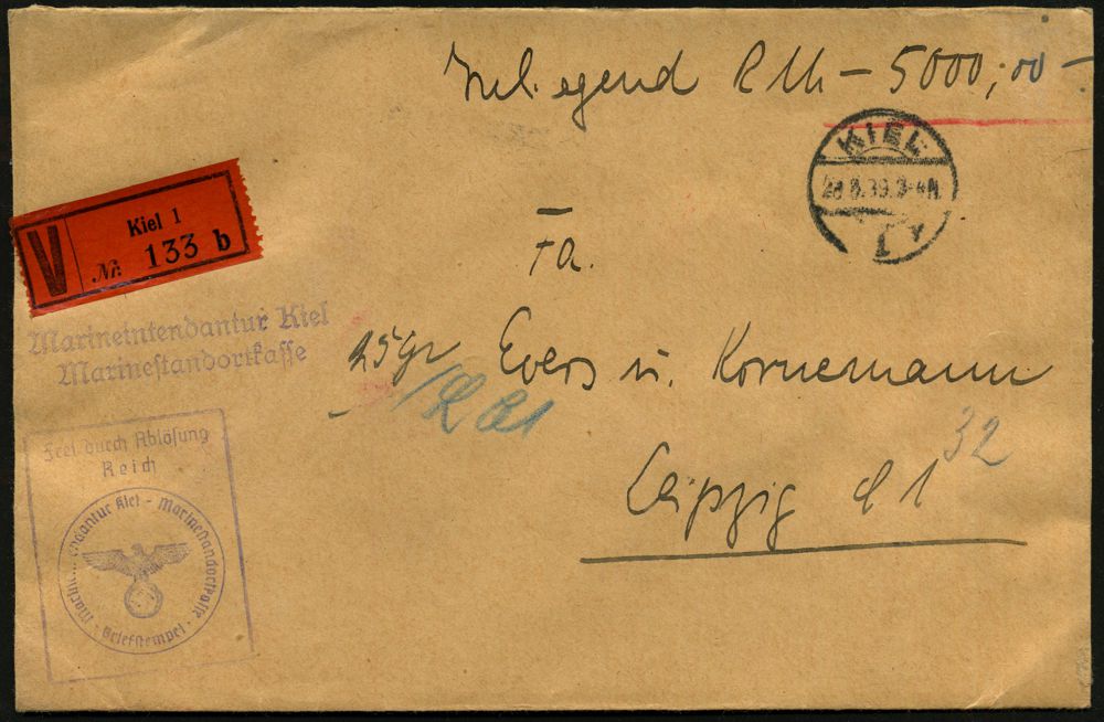 | 3053 | 45 € | DEUTSCHE KRIEGSMARINE 1933-1939 : KIEL/ *1v 1939 (28.8.) 1K-Brücke + viol. Ra.: Frei durch/Ablösung/Reich/ Marineintendentatur Kiel Marinestandortkasse + viol. 2L , orange VZ: Kiel 1/b, rs. 2 rote Marine-Lacksiegel, sauber gest., seltener Inl.-Wert-Bf. 5000.- RM (drei Tage vor Beginn des II. Weltkrieges!) | | |