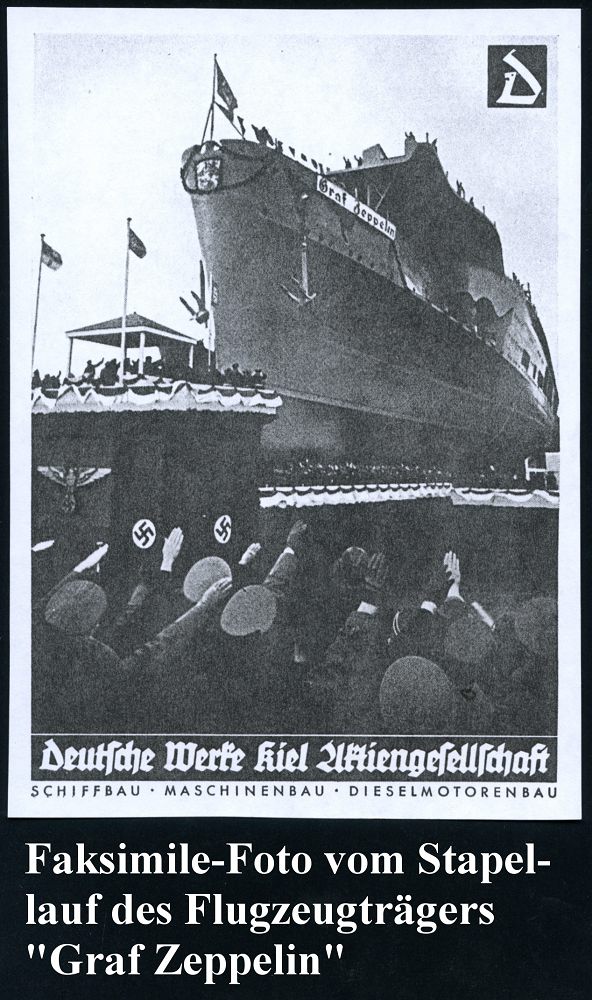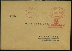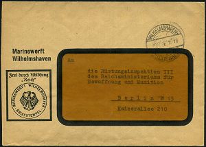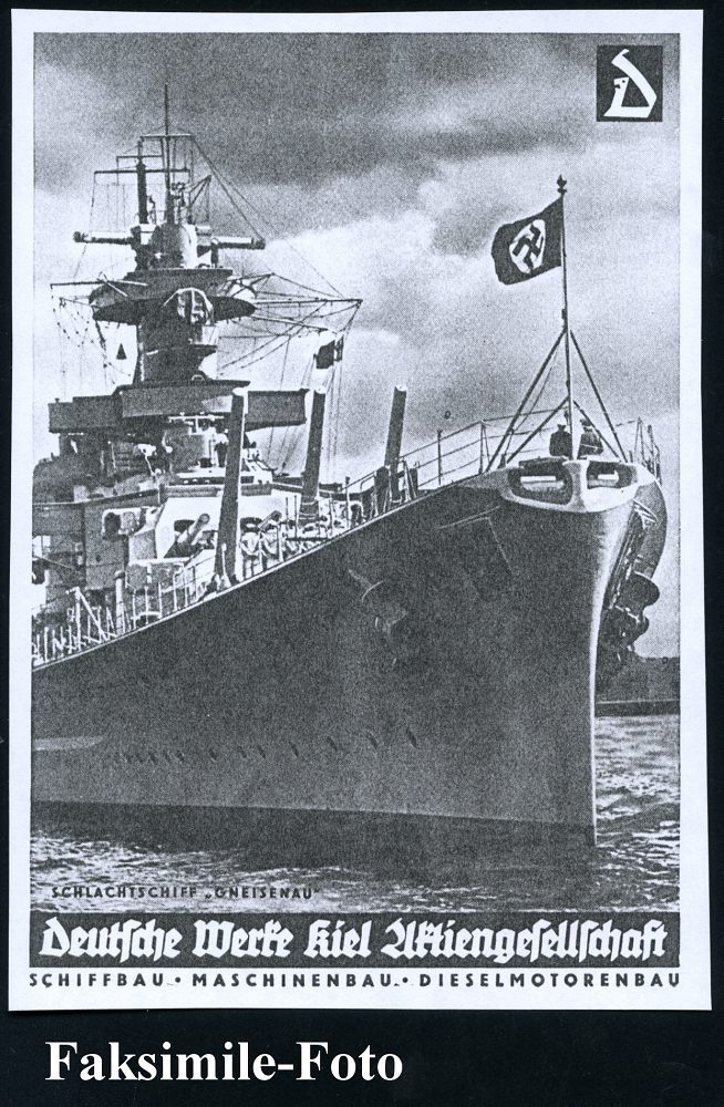 | 3052 | 30 € | DEUTSCHE KRIEGSMARINE 1933-1939 : KIEL/ 1/ D/ Deutsche Werke Kiel/ AG 1929 (7.5.) AFS Francotyp "Bogenrechteck" = ex Kaiserliche Werft, Kiel, vor und im I. Weltkrieg Bau von Kriegsschiffen u.a. Schlachtschiff "Gneisenau", Flugzeugträger "Graf Zeppelin" u.v.a. (Monogr.) rs. motivgl., zweifarbiger Abs.-Vordruck, Fernbf. + 2 Faksimile-Bilder (Dü.E-1Am) | | |