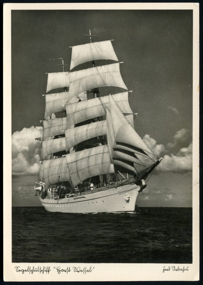 | 3073 | 10 € | DEUTSCHE KRIEGSMARINE 1933-1939 : DEUTSCHES REICH 1938 (ca.) s/w.-Foto-Ak.: Segelschulschiff "Horst Wessel", Foto Ferd. Urbahns , ungebr. (Verlag EAS, Schwerdtfeger Nr.380, München) | | |
