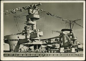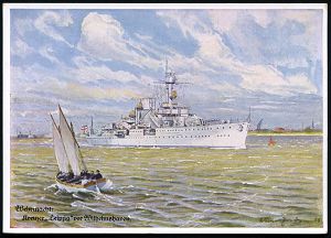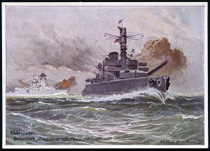 | 3058 | 12 € | DEUTSCHE KRIEGSMARINE 1933-1939 : DEUTSCHES REICH 1935 Color-Künstler-Ak.: Panzerschiff "Deutschland" u. "Admiral Scheer" (feuernd) sign. W. Zeeden ´35 , ungebr. (Verlag Andelfinger, München) | | |