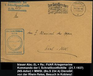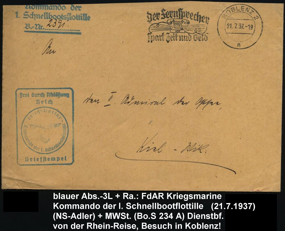 | 3079 | 25 € | DEUTSCHE MARINE-SCHIFFSPOST 1933-1939 : Koblenz 2 1937 (21.7.) Serien-MaWSt.: KOBLENZ 2/n/Der Fernsprecher/spart Zeit u.Geld (oben etw. knapp geöffnet) + bl. Abs.-3L: Kommando der/1. Schnellbootsflottille.. + Ra.: FdAR/ Kommando der I. Schnellbootflottille = Schnellboot-Besuch in Koblenz!, seltener Dienstbf. (Bo.S 234 A) | | |