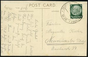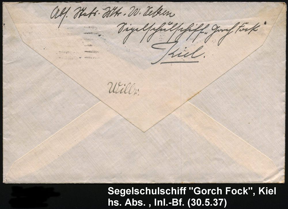 | 3078 | 25 € | DEUTSCHE MARINE-SCHIFFSPOST 1933-1939 : Kiel 1 1937 (30.5.) MaWSt.: KIEL 1/gg/KAMPF/dem/Verderb! + 6 Wellen rechts (in Sütterlin, Bo.S 253 C) rs. hs. Abs.: "..Segel-schulschiff "Gorch Fock", Kiel", frankierter Fernbf. (Mi.519) | | |