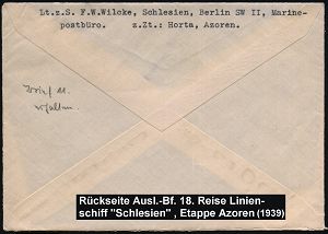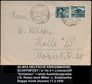| 3093 | 35 € | DEUTSCHE MARINE-SCHIFFSPOST 1933-1939 : DEUTSCHES REICH / AZOREN 1937 (17.2.) 2K-Bord-PA: DEUTSCHE KRIEGSMARINE-SCHIFFSPOST/d/Nr.4 = Linienschiff "Schlesien" = 18. und letzte Ausbildungsreise Atlantik, Mittel- u. Südamerika!, Etappe Horta, Azoren +rs. entspr. Abs.!, Übersee-Bf. (Inl.-Tarif) n. Halle/S. (Mi.673, 684) | | |