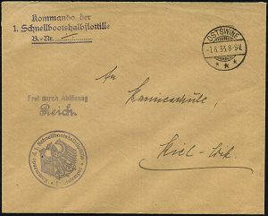 | 3080 | 18 € | DEUTSCHE MARINE-SCHIFFSPOST 1933-1939 : OSTSWINE/ *** 1933 (7.6.) 1K-Gitter + viol. 1K-HdN: Kommando d. 1. Schnellbootfalbflottille noch alter Weimarer Adler + Anker + 2L: Frei durch Ablösung/Reich + viol. 3L, klar gest. Marine-Dienstbf. n. Kiel | | |