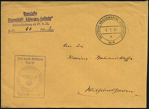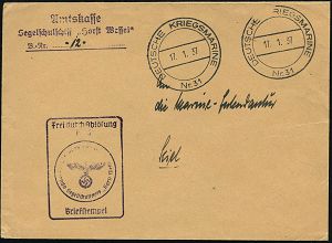 | 3090 | 20 € | DEUTSCHE MARINE-SCHIFFSPOST 1933-1939 : WESERMÜNDE-GEESTEMÜNDE/ f 1938 (14.11.) 2K-Steg + viol. 3L: Kommando/ Zerstörer "Wolfgang Zenker".. + viol. Ra.: Frei durch Ablösung/Reich.. (unten undeutl.) Marine-Dienstbf. n. Kiel | | |
