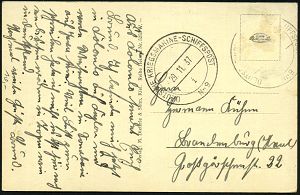 | 3092 | 25 € | DEUTSCHE MARINE-SCHIFFSPOST 1933-1939 : DEUTSCHES REICH 1938 (29.1.) 2K-Bord-PA.: DEUTSCHE KRIEGSMARINE-SCHIFFSPOST/d/Nr.4 + viol. 3L: Linienschiff "Schlesien".. + viol. Ra.: FdA/R/ Amtskasse Linienschiff "Schlesien", 2x klar gest. Dienstbf. n. Wilhelmshaven (Kat.Nr.X) | | |