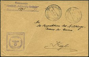 | 3085 | 25 € | DEUTSCHE MARINE-SCHIFFSPOST 1933-1939 : DEUTSCHES REICH 1937 (7.1.) 2K-Bord-PA.: DEUTSCHE KRIEGSMARINE-SCHIFFSPOST/h/Nr.8 = Linienschiff "Schleswig-Holstein", Ausbildungsreise Süd- u. Mittelamerika , 2 viol. HdN: FdA/Reich/Amtkasse Linienschiff "Schleswig-Holstein" + viol. 4L., klar gest. Marine-Dienstbf. n. Wilhelmshaven | | |