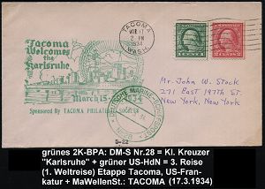 | 3095 | 40 € | DEUTSCHE MARINE-SCHIFFSPOST 1933-1939 : U.S.A. / DEUTSCHES REICH 1934 (17.5.) 2K-Bord-PA: DEUTSCHE MARINE-SCHIFFSPOST/Nr.28 in g r ü n = Leichter Kreuzer "Karlsruhe", 3. Auslands- u. 1. Weltreise, Etappe Tacoma, Wash., U.S.A. + grüner HdN: Tacoma Welcomes the Karlsruhe.. , US.-Frankatur 1 u. 2 C. Washington, MaWellenSt.: TACOMA/WASH., klar gest. Inl.-Bf. n. New York, seltene Stempelfarbe! | | |