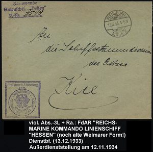 | 3077 | 25 € | DEUTSCHE MARINE-SCHIFFSPOST 1933-1939 : FLENSBURG-/ MÜRWIK 1933 (13.12.) 1K-Gitter + viol. HdN: FdA/R/REICHSMARINE/KOMMANDO LINIENSCHIFF "HESSEN" (Weimarer Adler) + viol. 3L: ..Linienschiff "Hessen" klar gest. Marine-Dienstbf. n. Kiel | | |
