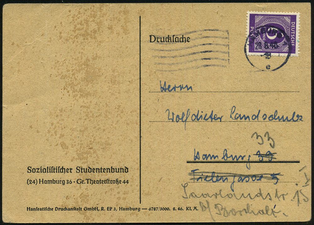 | 3462 | 25 € | DEUTSCHLAND NACH DEM 8. MAI 1945: ALLIIERTE BESETZUNG / KONTROLLRAT : HAMBURG 1/ e 1946 (28.8.) MaWellenSt. auf Vordr.-Orts-Kt.: Sozialist. Studentenbund (anschriftenseitig fleckig) rs. Einladung zur ZONENTAGUNG SOZIALIST. STUDENTEN.. Es spricht Dr. Kurt S c h u m a c h e r.. "Student u. sozialist. Politik" (SPD), seltener Beleg!,, Schumacher war NS-Widerstanskämpfer u. KZ-Insasse ! (Mi.916) | | |
