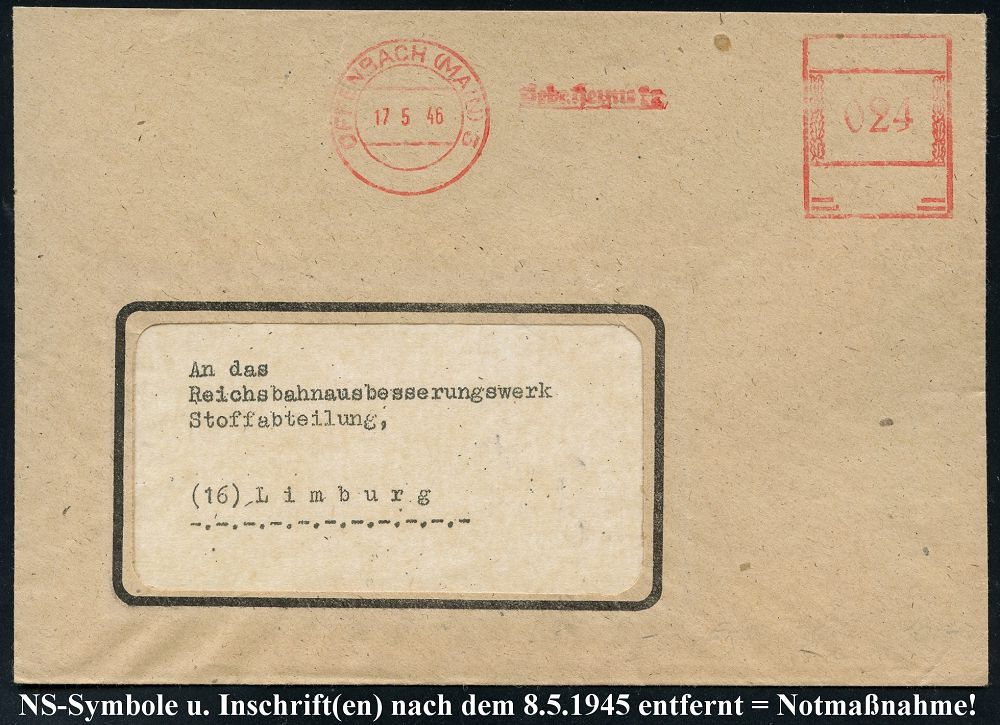 | 3481 | 25 € | DEUTSCHLAND NACH DEM 8. MAI 1945: ALLIIERTE BESETZUNG / KONTROLLRAT : OFFENBACH (MAIN) 3/ Gebr.Heyne 1946 (17.5.) seltener, aptierter AFS Francotyp "Hakenkreuz" = alles enrtfernt bis auf Eichen-Ranke = Notmaßnahme , auch Teile des Abs.-Klischees entfernt! (vergl. Nr.941)rs. Abs.-Vordr.: Gebr. Heyne GmbH, FABRIKATION nach D. I.-NORMEN.. (DIN-Norm-Schrauben) seltener Fernbf. (Dü.E-12 Y-98o) | | |