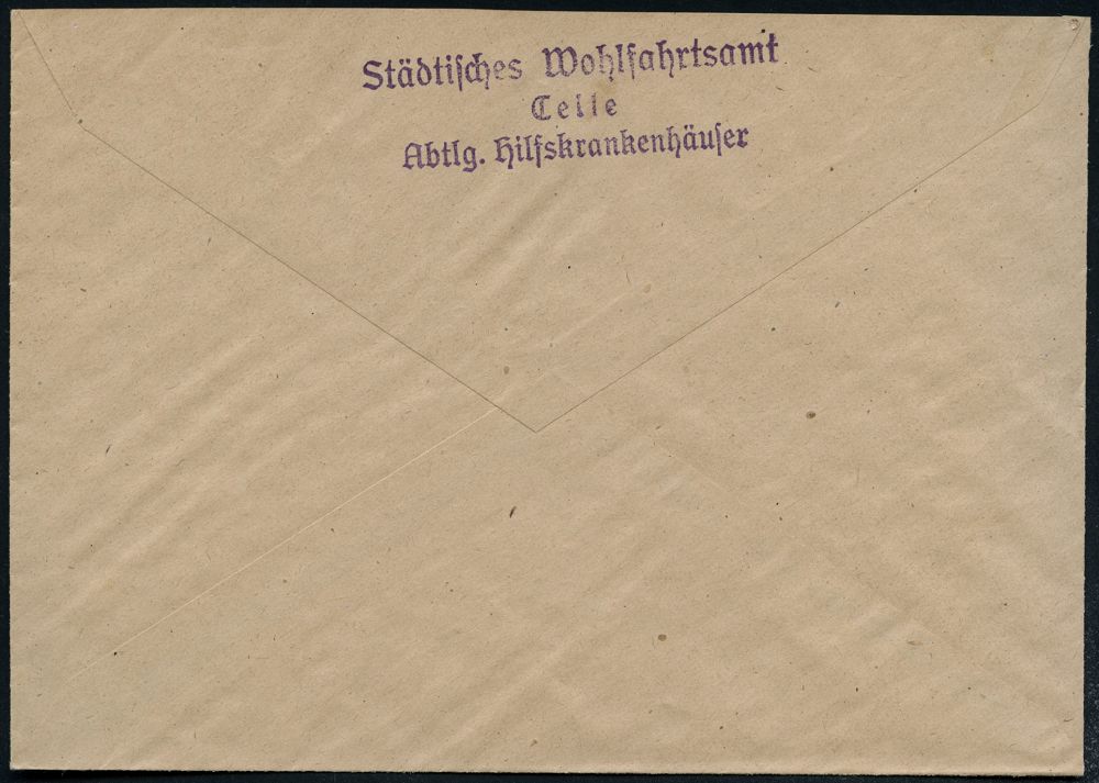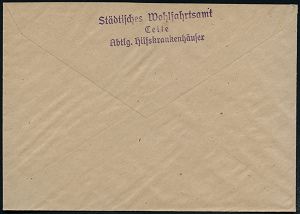 | 3439 | 20 € | DEUTSCHLAND NACH DEM 8. MAI 1945: ALLIIERTE BESETZUNG / KONTROLLRAT : CELLE/ 1/ Stadtverwaltung 1945 (9.11.) aptierter AFS Francotyp Francotyp "Hakenkreuz" = nur Hakenkreuz entfernt = Notmaßnahme! (Schloß, stilis. Pferdegiebel) + viol. Abs.-3L: Städt. Wohlfahrtsamt../Abt. Hilfskrankenhäuser, Fern-Dienstbf. (Dü.E-12B-85o = seltene Type) | | |