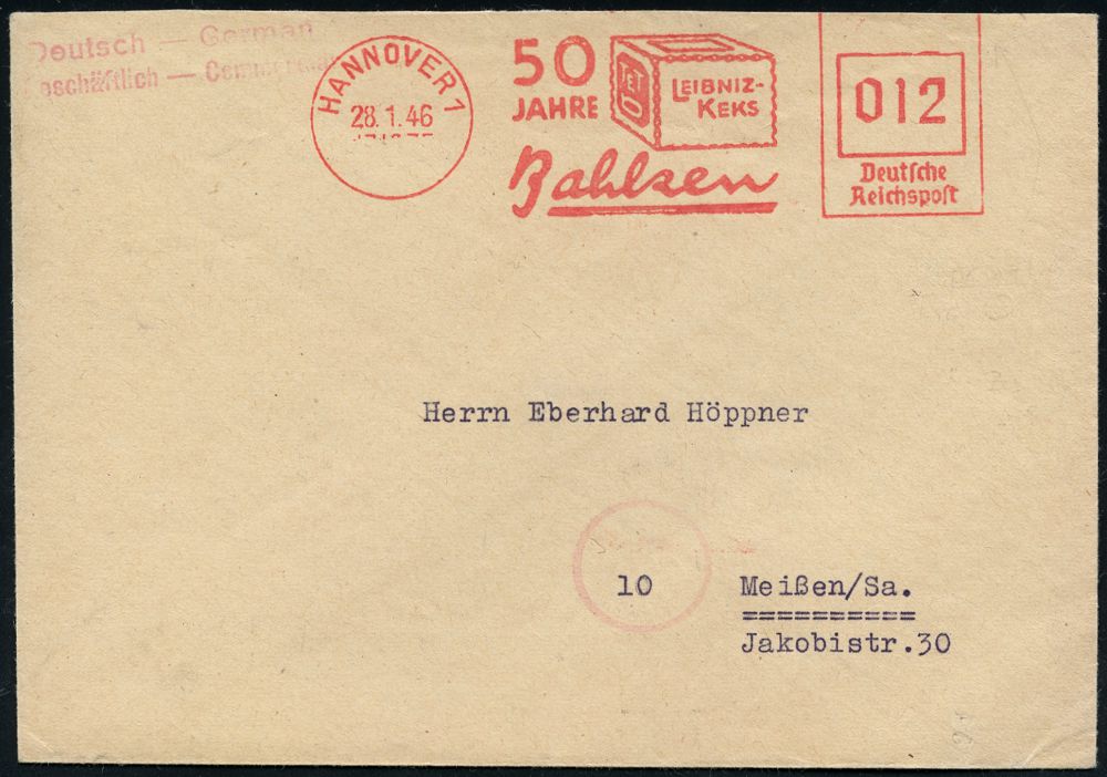 | 3466 | 25 € | DEUTSCHLAND NACH DEM 8. MAI 1945: ALLIIERTE BESETZUNG / KONTROLLRAT : HANNOVER 1/ 50 JAHRE/ Tet/ LEIBNITZ/ KEKS/ Bahlsen 1945 (28.1.) aptierter AFS Francotyp "Reichsadler" = entfernt = Notmaßnahme! (Keks-Packung mit alt-ägypt. "Tet"-Hieroglyphe) rs. Abs.-Vordruck, Fern-Bf. in die SBZ n. Meißen (Dü.E-13J-123o) | | |