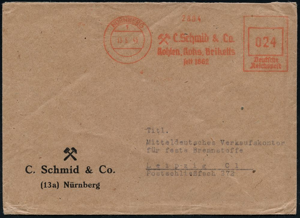 | 3479 | 20 € | DEUTSCHLAND NACH DEM 8. MAI 1945: ALLIIERTE BESETZUNG / KONTROLLRAT : NÜRNBERG/ 1/ C.Schmidt & Co./ Kohlen,Koks,Briketts/ seit 1862 1946 (16.5.) aptierter AFS Francotyp "Reichsadler" = entfernt , aus dem Ortsstempel wurde "STADT DER REICHSPARTEITAGE" entfernt = Notmaßnahme! (2 Bergbau-Hämmer) motivgl. Firmen-Bf. (rs. Abs.-Vordruck) n. Leipzig, Kohle = das "Gold" der Nachkroegsjahre! (Dü.E-13J-129h) | | |