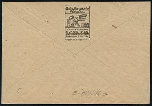 | 3469 | 75 € | DEUTSCHLAND NACH DEM 8. MAI 1945: ALLIIERTE BESETZUNG / KONTROLLRAT : HEIDELBERG 1/ Lederfarben/ Nuarin/ Klebstoffe.. 1946 (20.2.) sehr seltener, unverändert weiterverwendeter AFS Postalia "NS-Adler" mit Ovalziffern 012 Pf. (Notmaßnahme nach 1945) auf Firmen-Bf.: CHEM. FARBENFABRIK HEINRICH ZAHN (Firmen-Logo), sehr seltener Fern-Bf. (Dü.E-9, Nr.232, unverändert!) | | |
