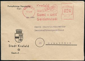 | 3473 | 25 € | DEUTSCHLAND NACH DEM 8. MAI 1945: ALLIIERTE BESETZUNG / KONTROLLRAT : KREFELD 1/ ..die/ Samt-u./ Seidenstadt 1946 (10.4.) aptierter AFS Francotyp "Reichsadler" = entfernt + Inschrift: "Deutsches Reich" = Notmaßnahme! (Seiden-Garnrolle) Kommunal-Bf. mit Stadtwappen, rs. Abs.-Vordruck (Dü.E-13AK-122o) | | |