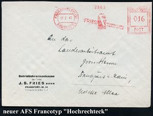 | 3449 | 18 € | DEUTSCHLAND NACH DEM 8. MAI 1945: ALLIIERTE BESETZUNG / KONTROLLRAT : FRANKFURT/ (MAIN) 1/ Frankallianz 1946 (26.2.) aptierter AFS Francotyp "Reichsadler" = entfernt + das Wort "Reichs", aber altes Firmen-Logo = Notmaßnahme! , Firmen-Bf. (rs. Klappenriß) n. Spielberg (Dü.E-13 Y-147o) | | |