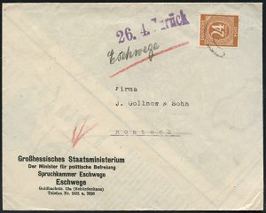 | 3442 | 20 € | DEUTSCHLAND NACH DEM 8. MAI 1945: ALLIIERTE BESETZUNG / KONTROLLRAT : Eschwege 1946 (26.4.) 24 Pf. Kontrollrat, EF auf Dienst-Bf.: Großhessisches Staatsministerium, Der Minister für politische Befreiung, Spruchkammer Eschwege.. + viol. 1L: Zurück, rs. amtl. 2L: Ohne nähere Wohnungsangabe/ nicht zu ermitteln, Dienst-Retour-Bf. (rs. kl. Rostspur) nach Rostock in die SBZ | | |
