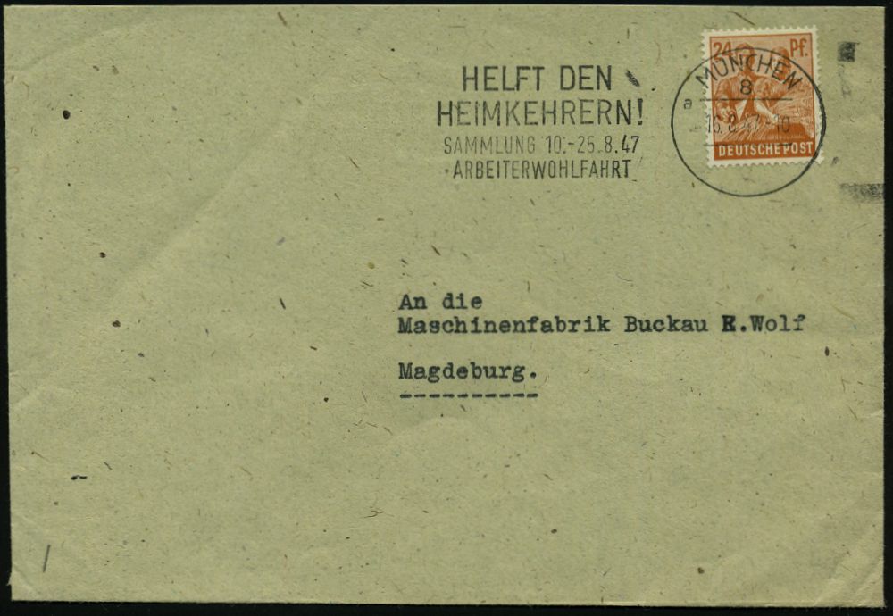 | 3493 | 18 € | WAST / SUCHDIENSTE / HEIMKEHRER : MÜNCHEN/ 8/ a/ HELFT DEN/ HEIMKEHRERN!/ SAMMLUNG/ ...ARBEITERWOHLWOHLFAHRT 1947 (16.8.) seltener, aptierter Serien-MWSt ("HAUPTSTADT DER BEWEGUNG" entfernt) Bedarfs-Bf. in die SBZ (Bo.S 452 A , nur 3 Wochen in nur 6 Orten Bayerns !) | | |