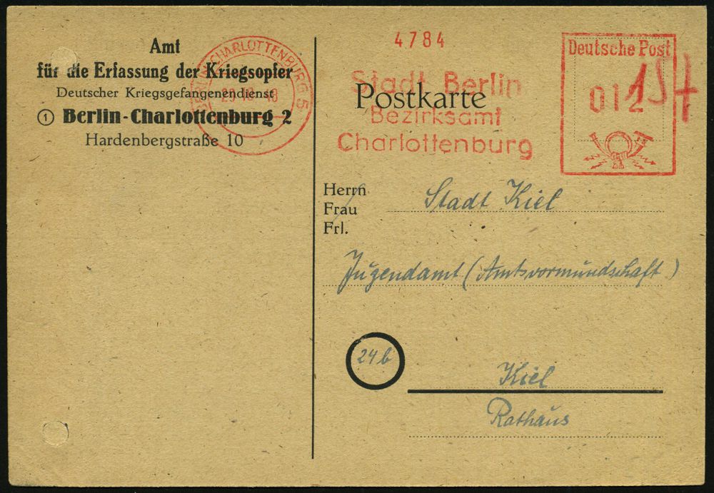 | 3490 | 20 € | WAST / SUCHDIENSTE / HEIMKEHRER : BERLIN-CHARLOTTENBURG 5/ Stadt Berlin/ Bezirksamt/ Charlottenburg 1948 (29.10.) AFS Francotyp 012 Pf. auf Vordruck-Kt.: Amt für die Erfassung der Kriegsopfer, Deutscher Kriegsgefangenendienst.. (Reg.-Lochung geschl.) an Jugendamt Kiel aus der Zeit der Berliner L u f t b r ü c k e ! (Dü.E-20CGh) | | |