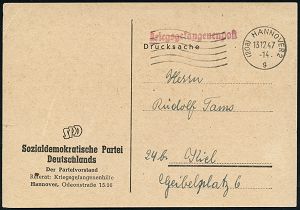 | 3492 | 20 € | WAST / SUCHDIENSTE / HEIMKEHRER : (20a) HANNOVER 2/ g 1947 (13.12.) MaWellenSt + roter 1L: Kriegsgefangenenpost auf Vordruck-Kt.: SPD.. Der Partei-vorstand, Referat: Kriegsgefangenenhilfe, rs. Text über eben jene Hilfe mit Faksimile "Hans Stephan" n. Kiel | | |
