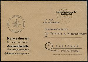 | 3494 | 18 € | WAST / SUCHDIENSTE / HEIMKEHRER : (13b) PASSAU/ l 1950 (28.4.) 2K-Steg + viol. 1K-HdN: Diäzösancaritasverband Passau / S u c h s t e l l e (Kreuz) portofreier Vordruck-Bf.: Heimatkartei für Oberschlesier, Auskunftsstelle über Kriegsgefangene.. n. Tübingen | | |
