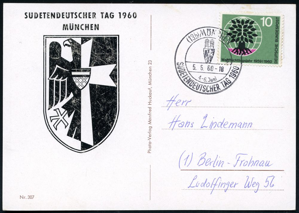 | 3508 | 16 € | VERTRIEBENE / FLÜCHTLINGE : (13b) MÜNCHEN/ c/ SUDETENDEUTSCHER TAG 1960 (5.6.) SSt (Wappenschild) motivgl. Sonder-Kt.! (Michaelis Nr.53 a, + 15.-DM,1991) n.West-Berlin (Bo.388 c) | | |