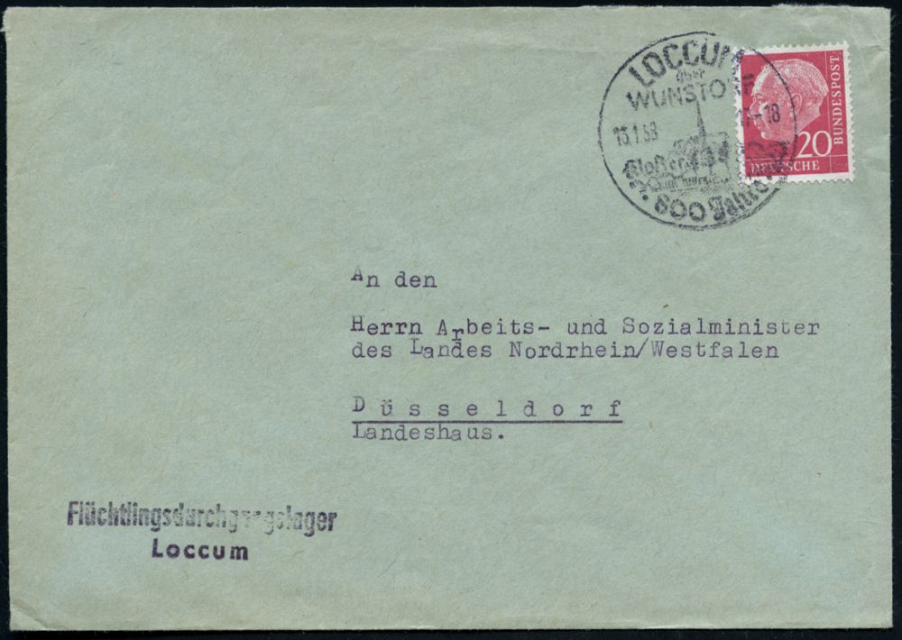 | 3506 | 15 € | VERTRIEBENE / FLÜCHTLINGE : LOCCUM/ über/ WUNSTORF/ Kloster/ 800 Jahre 1958 (13.1.) HWSt = Kloster (mit Kirche) + viol. 1L: Flüchtlingsdurchgangslager/ Loccum, Dienst-Bf. an Sozialminister, Düsseldorf (Bo.2) | | |