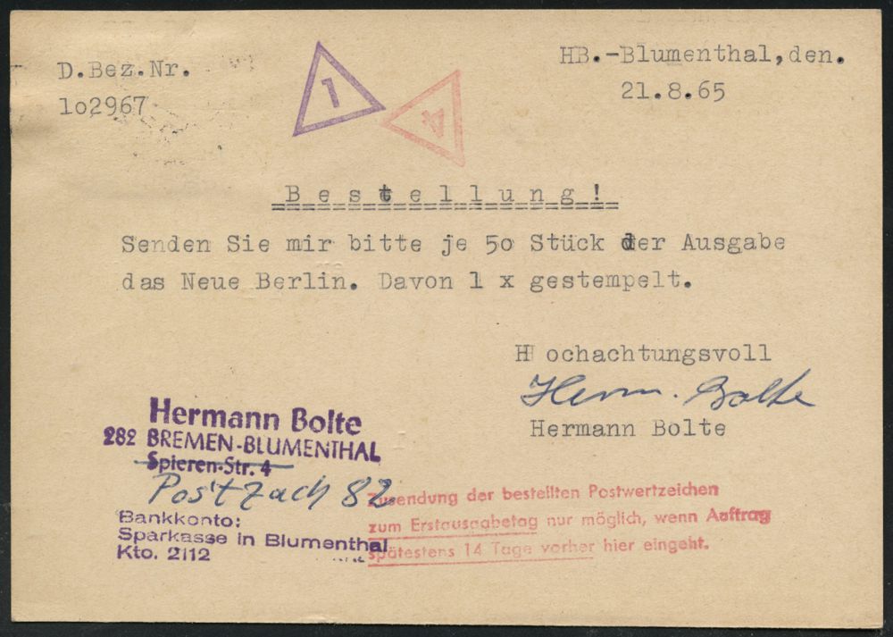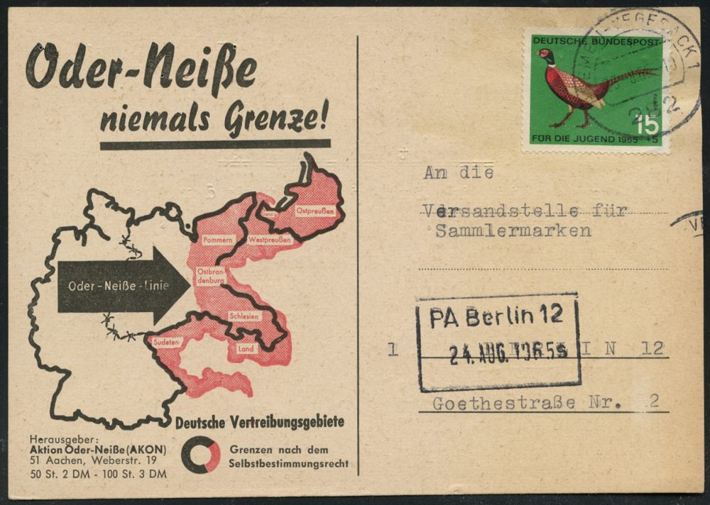 | 3500 | 20 € | VERTRIEBENE / FLÜCHTLINGE : 282 BREMEN-VEGESACK 1/ f 1965 (23.8.) 1K-Segment auf zweifarbiger Propagabda-Kt.: Oder-Neiße niemals Grenze!.. Deutsche Vertreibungsgebiete (mit Landkarte u. Gebieten, von wo Deutsche vertrieben wurden oder geflüchtet sind) Bedarfs-Kt. n. West-Berlin ! | | |