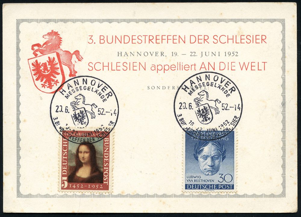 | 3502 | 25 € | VERTRIEBENE / FLÜCHTLINGE : HANNOVER/ MESSEGELÄNDE/ 3.BUNDESTREFFEN DER SCHLESIER 1952 (22.6.) SSt (Pferd, Wappen) klar auf 30 Pf. Beethoven (Mi.Bln 87, + 70.- EUR) u. 5 Pf. Mona Lisa, rs. auf Sonder-Kt. (Michaelis Nr.18, + 30.- DM, 1991) Bedarfs-Inl.-Karte, Aufgabe in BEERENBOSTEL (Bo.101) | | |