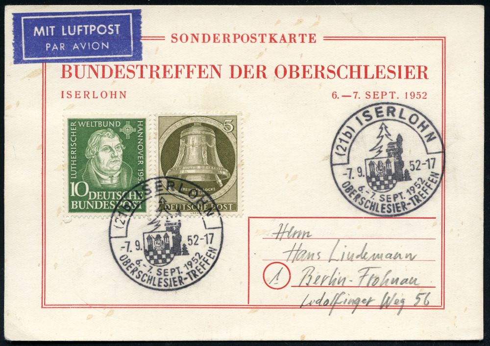 | 3505 | 18 € | VERTRIEBENE / FLÜCHTLINGE : (21b) ISERLOHN/ OBERSCHLESIER-TREFFEN 1952 (7.9.) SSt (Wappen etc.) 2x klar gest. Sonder-Kt. = Michaelis unbekannt!, Inl.-Flp.-Karte n. West-Berlin (Bo.4) | | |