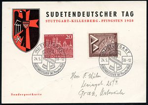 | 3510 | 12 € | VERTRIEBENE / FLÜCHTLINGE : (14a) STUTTGART/ SUDETENDEUTSCHER TAG.. 1958 (24.5.) SSt = Flagge um TV-Turm . auf zweifarbiger Sonder-Kt. (Michaelis Nr.31, + 15.- DM, 1991, Bugspur) klar gest. Ausl.-Karte (Bo.242) | | |