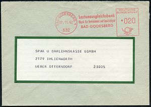 | 3499 | 15 € | VERTRIEBENE / FLÜCHTLINGE : 532 BAD GODESBERG 1/ Lastenausgleichsbank/ Bank für Vertriebene u.Geschädigte.. 1962 (7.11.) AFS Francotyp mit Orts-1K mit kleiner, neuer PLZ , rs. Abs.-Vordruck, Fern-Bf. (Dü.E-23DO) | | |