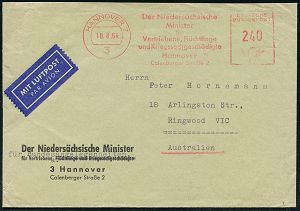 | 3504 | 35 € | VERTRIEBENE / FLÜCHTLINGE : 3 HANNOVER 7/ Der Niedersächs./ Minister/ für/ Vertriebene,Flüchtlinge/ u.Kriegsgeschädigte.. 1964 (10.8.) AFS Francotyp 240 Pf. auf entspr. Übersee-Flp.-Dienst-Bf. nach Australien! (4. Portostufe, 4. Zone, Götz + 75.- DM), sehr seltene Portostufe! (Dü.E-23CO) | | |