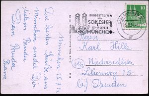| 3507 | 15 € | VERTRIEBENE / FLÜCHTLINGE : (13b) MÜNCHEN BPA1/ af/ BUNDESTREFFEN/ DER/ SCHLESIER/ 13.-17.SEPT. 1951 (18.8.) seltener MWSt (schles. Wappen, Frauenkirche) klar gest. Bedarfs-Ak.: Hofbräuhaus (Bo.249 A) | | |