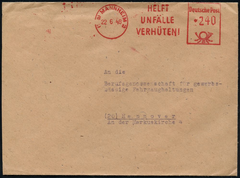| 3570 | 130 € | WÄHRUNGSREFORM 1948 (West-Zonen) / ZEHNFACH-FRANKATUREN : (17a) MANNHEIM 2/ HELFT/ UNFÄLLE/ VERHÜTEN! 1948 (22.6.) AFS Francotyp "Posthorn" 240 Pf. Zehnfach-Frankatur = Währungsreform West! (durch Stpl.-Defekt ist Teil der PLZ heraugebrochen) rs. Abs.: Berufsgenossenschaft Nahrungsmittel u. Fremdenverkehr.., seltener, portorichtiger Fern-Bf. (Mi.ZF 5 a, + 350.- EUR) | | |