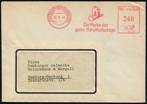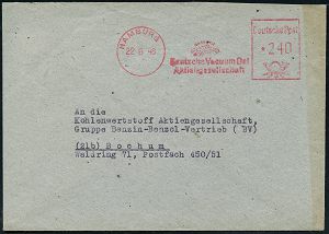 | 3565 | 130 € | WÄHRUNGSREFORM 1948 (West-Zonen) / ZEHNFACH-FRANKATUREN : HAMBURG/ GARGOYLE/ Deutsche Vaccum Oel/ AG 1948 (22.6.) AFS Francotyp 240 Pf. Zehnfach-Frankatur = Währungsreform Westzonen (Drachen-Logo) rs. Abs.-Vordruck, Fern-Bf. n. Bochum (Mi.ZF 5a, 350.- EUR) | | |