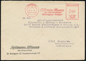 | 3573 | 130 € | WÄHRUNGSREFORM 1948 (West-Zonen) / ZEHNFACH-FRANKATUREN : STUTTGART/ 13/ Heilmann & Liffmann/ Bau-AG.. 1948 (22.6.) AFS Francotyp "Posthorn" 240 Pf. Zehnfach-Frankatur = Währungsreform! klar auf portorichtigem Firmen-Fern-Bf. n. Ferthofen seltener Beleg! (Mi.ZF 5a, + 350.- EUR) | | |