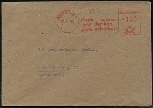| 3566 | 130 € | WÄHRUNGSREFORM 1948 (West-Zonen) / ZEHNFACH-FRANKATUREN : HAMBURG 1/ Strom sparen/ erst denken-/ dann schalten! 1948 (21.6.) AFS Francotyp "Posthorn" 160 Pf., (rs. Abs.-Vordruck: Hamburgische Electricitäs-Werke AG (rs. Klappenriß) klar gest. Orts-Bf., seltene 10fach-Frankatur! (Mi.ZF 5 a, 350.- EUR) | | |
