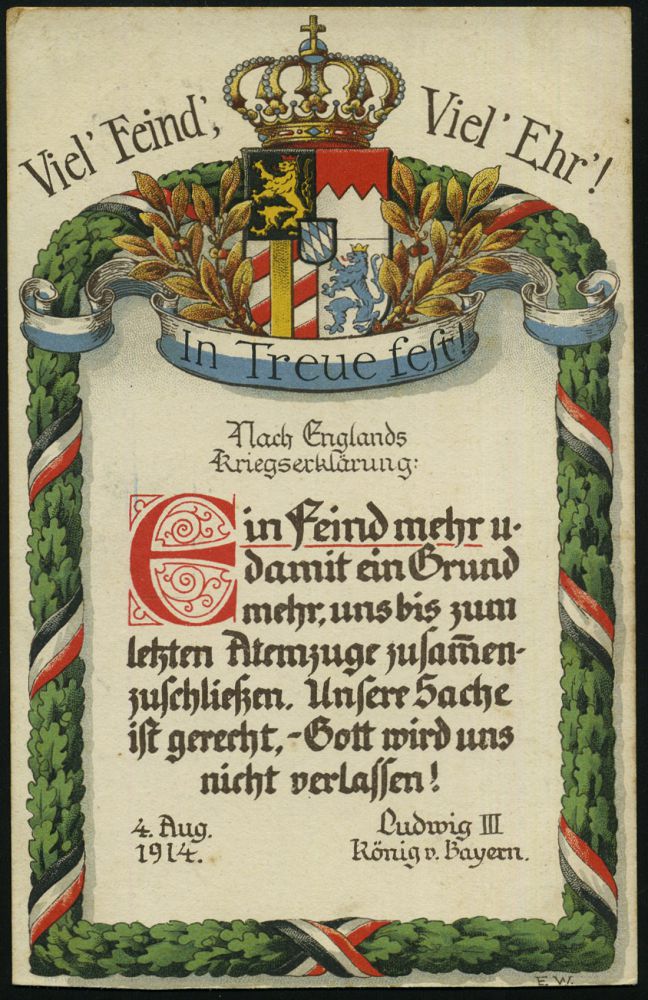 | 369 | 14 € | I. WELTKRIEG 1914 - 18 : MÜNCHEN/ *2* 1914 (12.10.) Band-MaSt. (Typ Sylbe) auf bayer. Color-Litho-Propaganda-Ak.: Viel Feind Viel Ehr!.. Zitat Ludwig III.vom 4. Aug. 1914 (Krone, Wappen Lorbeer, Eichenlaub etc.) sign. E. W. (Verlag G. Leyder, Pasing) klar gest. Feldpost-Kt. | | |