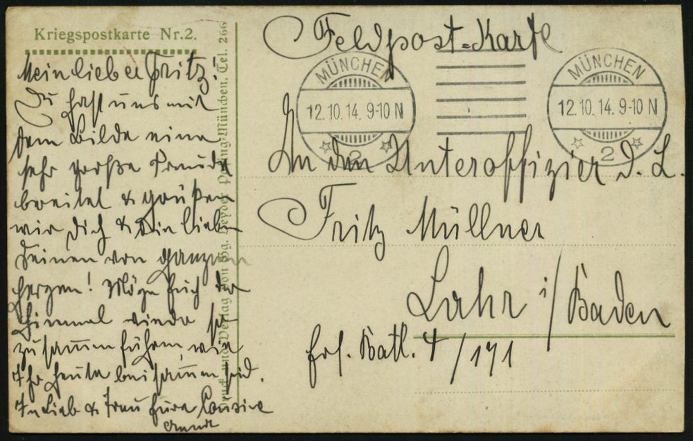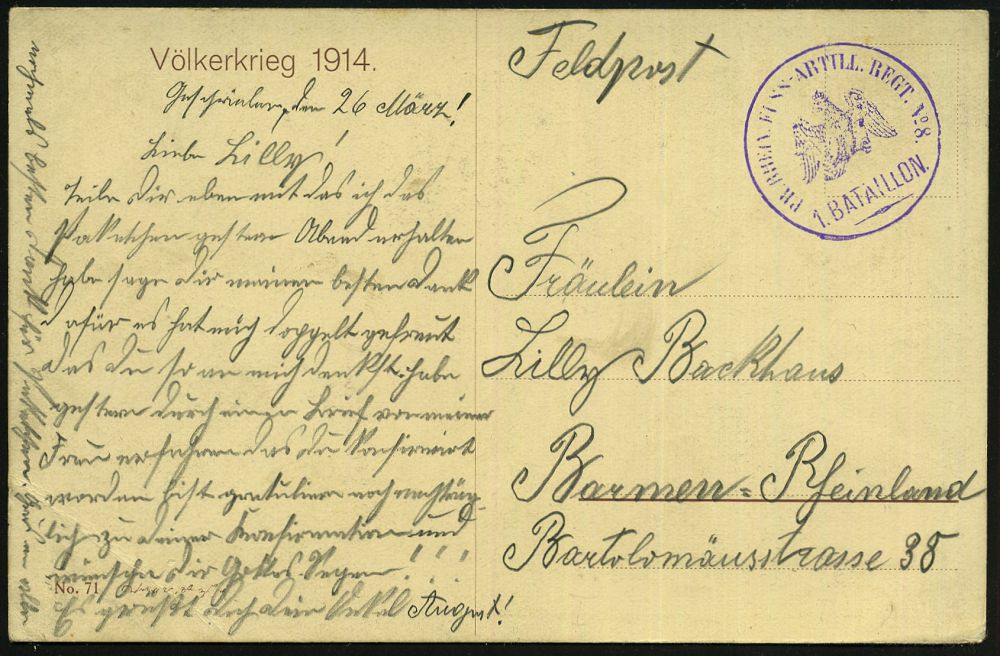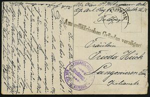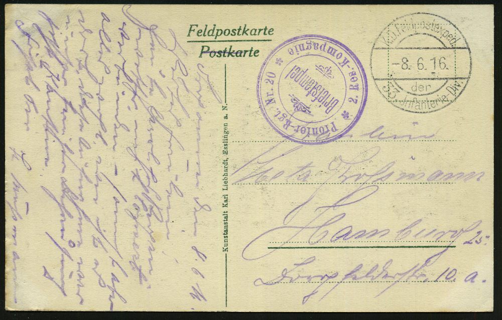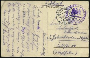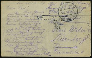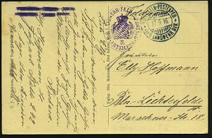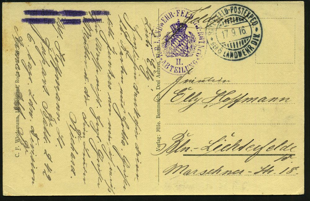 | 417 | 15 € | I. WELTKRIEG 1914 - 18 : DEUTSCHES REICH 1916 (17.9.) bayer. 2K-Gitter: BAYER. FELD-POSTEXPED./DER 6. LANDWEHR DIV. (Kat.Nr.2725) + viol. Oval-HdN: K. B. LANDWEHR-FELD-ART.RGT. Nr.6.. (Wappen) s/w.-Foto-Feldpost-Ak.: ober-elsässischer Ort, Inschrift unkenntlich gemacht = Selbst-Zensur! n. Bln | | |