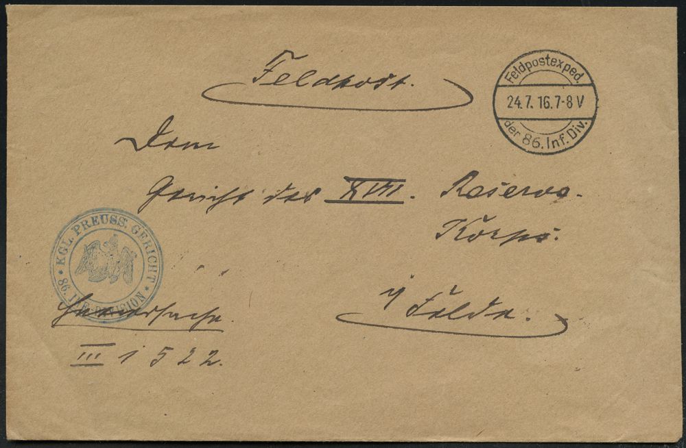 | 413 | 15 € | I. WELTKRIEG 1914 - 18 : DEUTSCHES REICH 1916 (20.6.) 1K-Brücke: Feldpostexped./der 86. Inf. Div. + bl. HdN: KGL. PREUSS. GERICHT/86. INF.-DIVISION klar gest. Feldpost-Bf. an das Gericht XVII A.K. (Ostfront), seltene Dienststelle = eigene Justizhoheit der Truppe! (inkl. Exekutionen) | | |