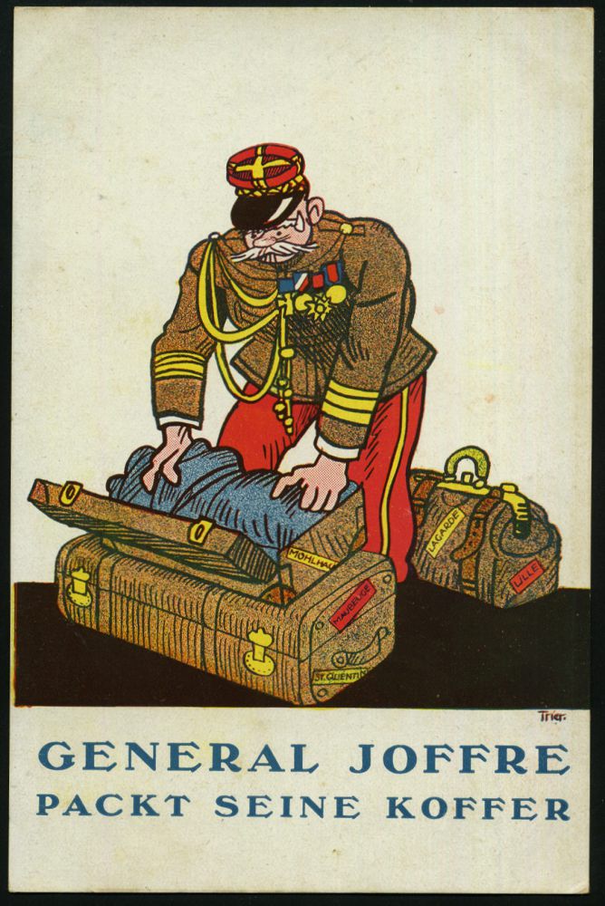 | 383 | 25 € | I. WELTKRIEG 1914 - 18 : DEUTSCHES REICH 1914 Color-Künstler-Propaganda-Ak.: GENRAL JOFFRE PACKT SEINE KOFFER, sign. (Walter) TRIER = berühmt durch Kästner-Kinderbuch- Illustrator etc. (1890 - 1951, umworben von Wald Disney! etc.) ungebr. (Berliner Verlag GmbH, W 9), selten! | | |