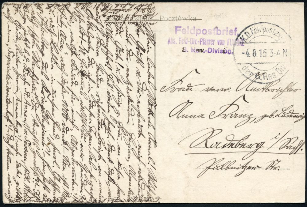 | 455 | 12 € | I. WELTKRIEG 1914 - 18 : DT. BES. RUSS. POLEN 1915 (4.8.) 1K-Brücke: K.D. Feldp. Exped./der 8. Res. Div.+ viol. 3L: ..Feld-Div.-Pfarrer von FUNCKE , s/w.-Feldpost-Foto-Ak.: Warschau (Viadukt. u. Marienstadtstr.) n. Radeberg | | |