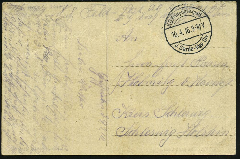 | 459 | 15 € | I. WELTKRIEG 1914 - 18 : DT. BES. RUSS. POLEN / BELARUS 1916 (10.4.) 1K-Brücke: K. D. Feldpostexped./d. Garde-Kav. Div. (Kat.Nr.1488) + hs. Abs.: "..1. Esk. II. G(arde) Drag(oner) Regt...Osten", klar gest. s/w.-Feldpost-Foto-Ak.: Pinsk n. Havetoft | | |