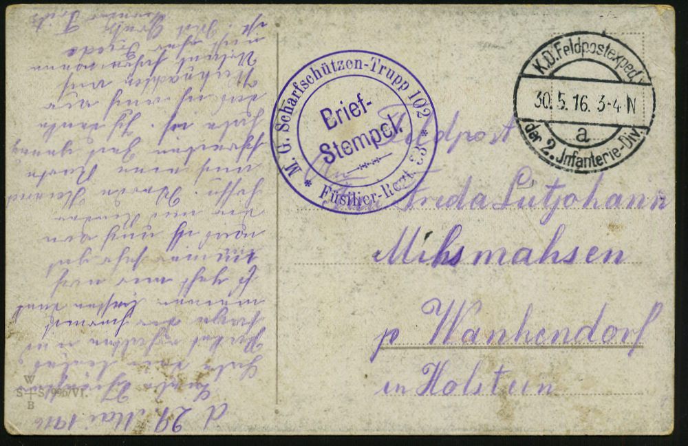 | 411 | 16 € | I. WELTKRIEG 1914 - 18 : DEUTSCHES REICH 1916 (30.5.) 1K-Brücke: K.D. Feldpostexped./a/der 2. Jnfanterie-Div. (Kat.Nr.452) + viol. 2K-HdN: M. G. Scharfschützen-Trupp 102/ Füsilier-Regt. 33, klar gest., passende, patriot. Feldpost-Ak.: Die von dem Maschinengewehr.. (mit Gedicht), seltene Kombination! | | |