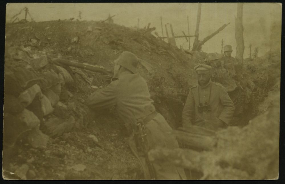 | 430 | 14 € | I. WELTKRIEG 1914 - 18 : DEUTSCHES REICH 1917 (14.5.) aptierte 1K-Brücke + viol. 1K-HdN: Res.-Inf.-Regt. 29 , individuelle Foto-Feldpost-Ak.: Schützengraben an vorderster Front n. Kön-Brühl | | |
