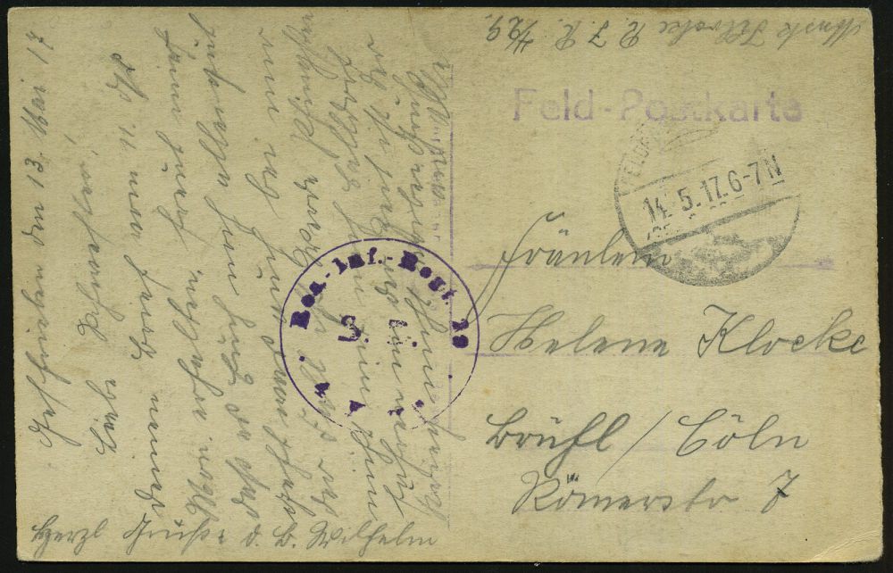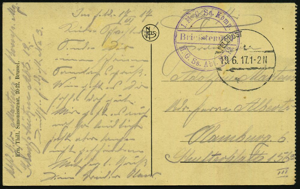 | 431 | 14 € | I. WELTKRIEG 1914 - 18 : DEUTSCHES REICH 1917 (19.6.) aptierte 1K-Brücke: FELDPOST = Tarnstempel + 2K-HdN: 1. M(aschinen) G.(ewehr) S(charf)s(chützen) Komp./M. G. Ss. Abt. Nr. 12 + hs. Abs., klar gest. s/w.-Foto-Feldpost-Ak.: Ypern (Rijksstraat) n. Hamburg | | |