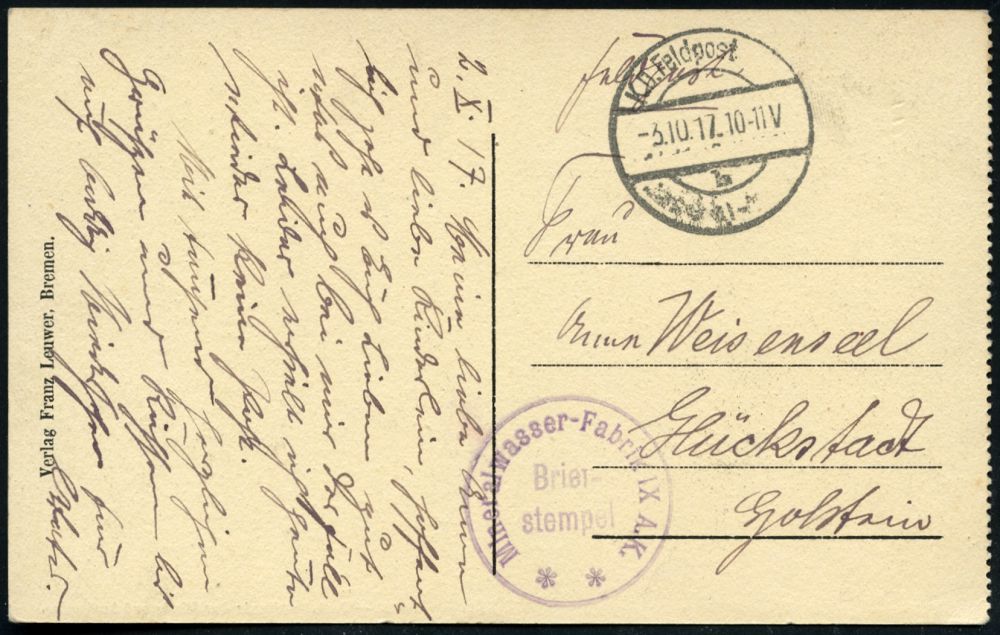 | 436 | 15 € | I. WELTKRIEG 1914 - 18 : DEUTSCHES REICH 1917 (3.10.) aptierte 1K-Brücke: K. D. Feldpost/b = Tarnstempel + viol.HdN: Mineralwasser-Fabrik IX A.K. , klar gest. Feldpost-Ak.: Bremen, Parkdenkmal "Der Blinde u. der Lahme" n. Glückstadt, seltene Einheit! | | |